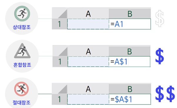 ‘= -> 셀 클릭 -> [f4] * 2’ 열단위로만 이동