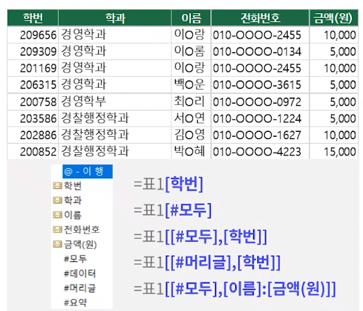 이제 동적 데이터화된 자료를 구조적 참조로 한 번에 데이터 계산을 해보자