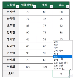 ‘표 디자인 -> 요약 행 체크’를 해주면 아래에 요약해주는 행이 생긴다!