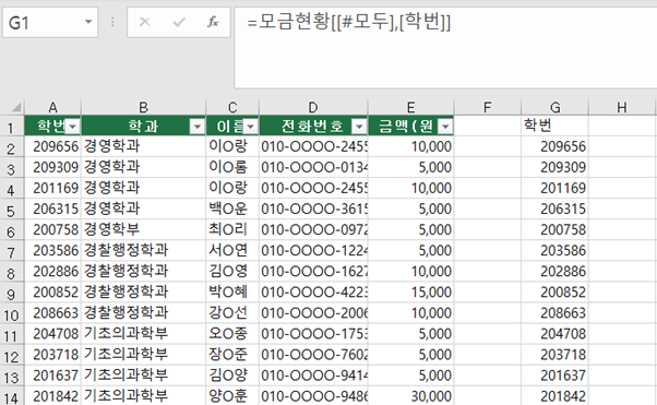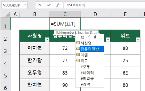 이제 동적 데이터화된 자료를 구조적 참조로 한 번에 데이터 계산을 해보자