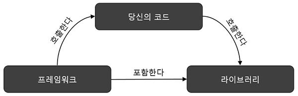 라이브러리는 활용 가능한 도구의 개념이며 제어 흐름의 주도성이 코드에게 있다