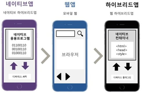 앱은 각 운영체제에 맞게 개발하는 네이티브 앱, 웹 사이트를 앱에 띄우는 웹 앱, 외부 형태는 네이티브면서 특정 부분에만 브라우저를 띄우는 하이브리드 앱으로 나뉜다