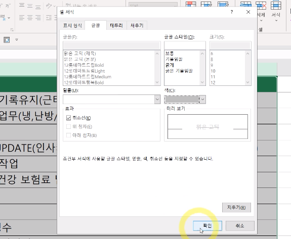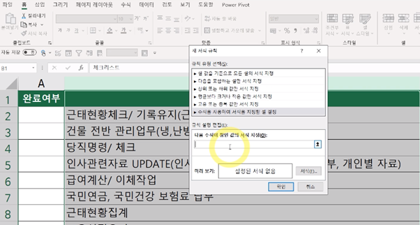 예를 들어 좌측 셀에 ‘o’ 표시가 되어있을 때만 서식을 지정하려면,,