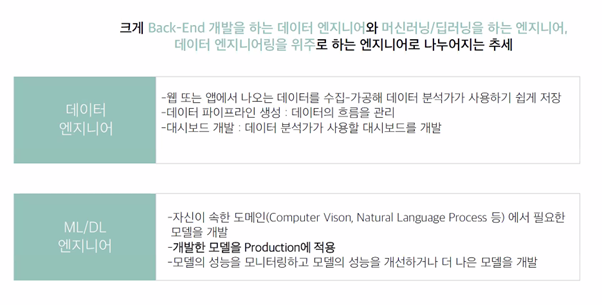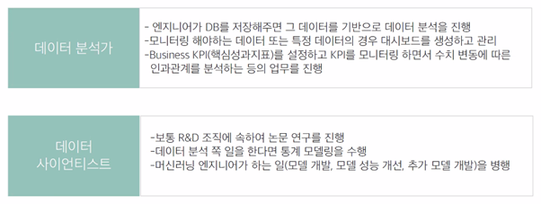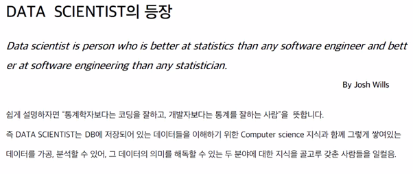 - 수학적 베이스가 탄탄하지 않다면 단순 SQL이나 파이썬을 쓰는 것으로는 데이터 사이언티스트는 무리가 있다. (석사, 박사 출신 선호)