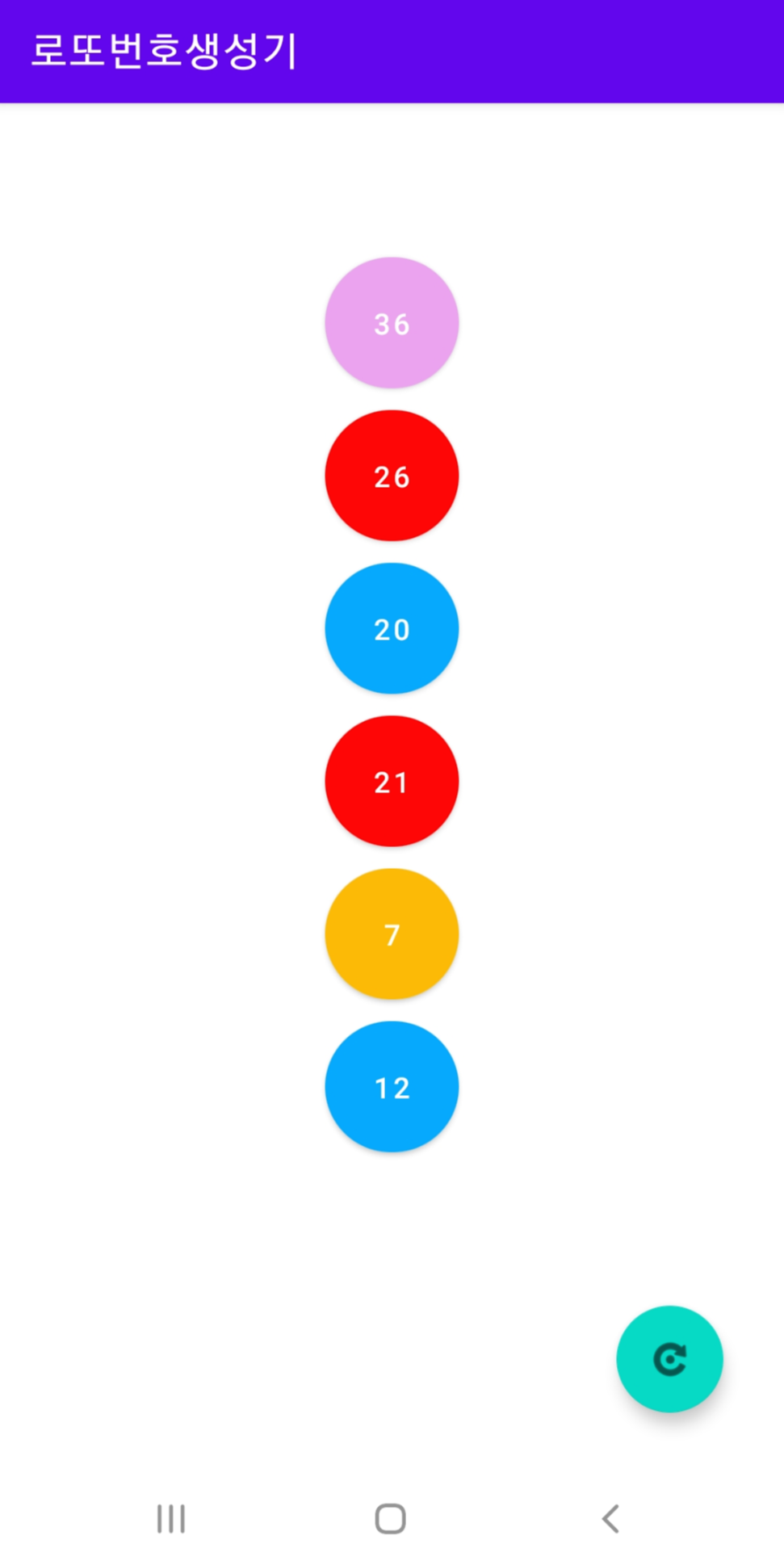 네이버 카페 '코뮤니티'에서 진행한 안드로이드 with 코틀린 7월 모각코 과정으로, 로또 번호 생성 앱을 구현해보는 프로젝트형 스터디. 버튼을 누르면 로또 번호가 새로고침된다.