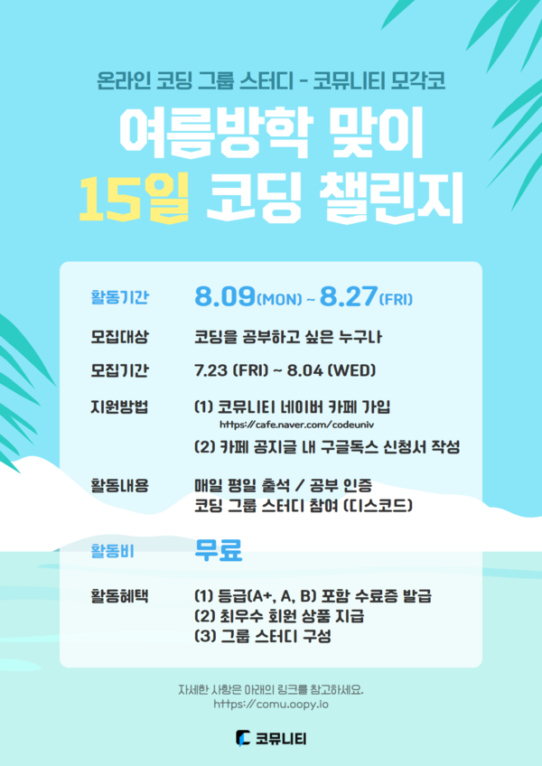 7월 23일, 네이버 카페 ‘코뮤니티’가 온라인 코딩 스터디인 모각코 8월 과정 모집을 시작했다.‘모두를 위한 코딩 커뮤니티’라는 구호에 걸맞게 학생, 직장인, 일반인, 개발자 모두에게 사랑