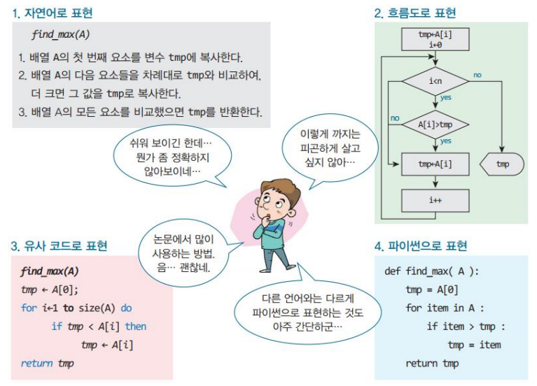 자연어로 표현 -> 흐름도로 표현 -> 유사 코드로 표현 -> 프로그래밍 언어로 표현
