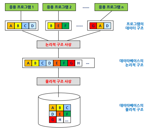 데이터 독립성(data independency): 물리적 구조가 변경되어도 논리적 구조에 영향을 주지 않고 알갱이만 변경됨. 논리적 구조가 바뀌더라도 마찬가지로 사상(mapping)에만 기록하면 되기 때문에 응용 프로그램에는 변화 없음