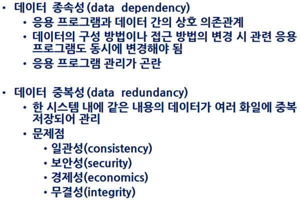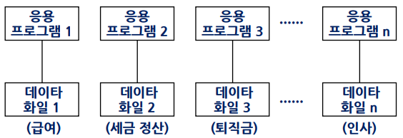 각각의 물리적 구조가 달라 응용 프로그램들이 데이터를 공유하지 못하는 문제 -> 종속성
