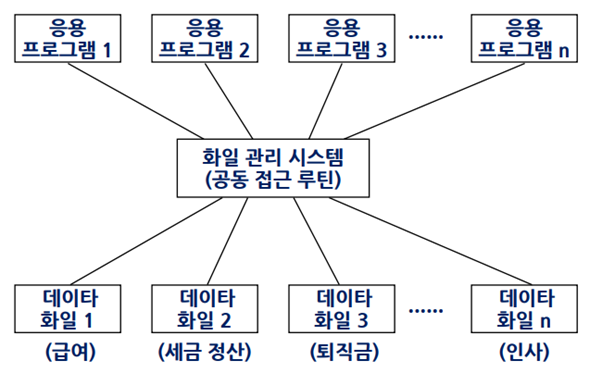 각각의 물리적 구조가 달라 응용 프로그램들이 데이터를 공유하지 못하는 문제 -> 종속성