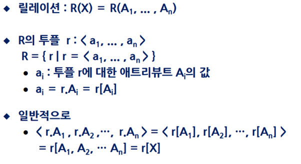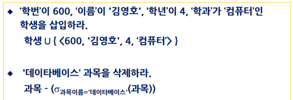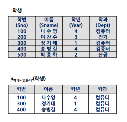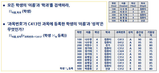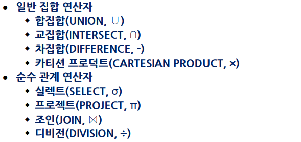 DB의 데이터인 Relation(tuple의 집합)이 관계 대수의 피연산자이며 다양한 연산이 가능하다