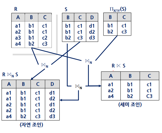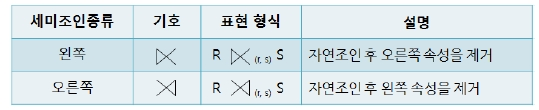 relation S와 자연 조인이 가능한 R의 tuple의 집합을 세미 조인(semijoin)이라고 한다