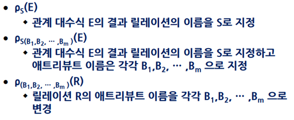 중간 처리 결과 relation이나 attribute의 이름을 적당히 변경하는 것을 개명(RENAME) 연산이라고 한다