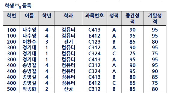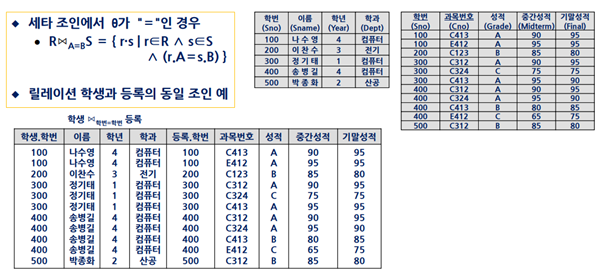 이러한 relation을 카티션 프로덕트 하고 연결고리의 공통 요소만 걸러낸 것을 동일 조인(equijoin)한다고 한다