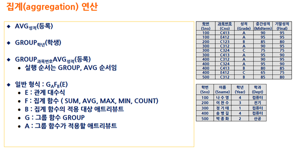 관계 대수에 다양한 연산을 적용하는 집계(aggregation) 연산이 가능하다