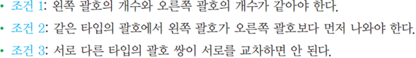 같은 종류, 맞는 쌍의 괄호를 순서를 지켜 잘 넣었는지 검사하는 것이다 [ ] { } ( )