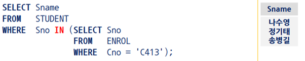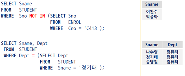 - NOT IN: 해당 조건을 만족하지 않는 테이블에서 (IN의 여집합)