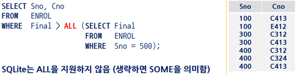 - ALL(-> SOME): 해당 조건을 만족하는 테이블 기준으로 조건을 거는 경우 (SQLite 미지원)