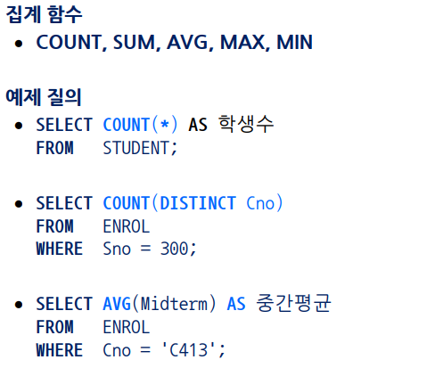 - COUNT: 해당 테이블의 중복을 허용한 튜플의 수를 반환한다 (distinct 추가 가능)