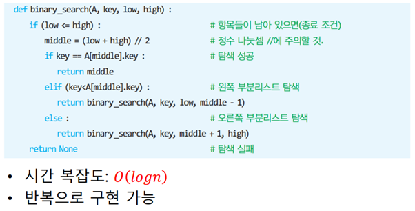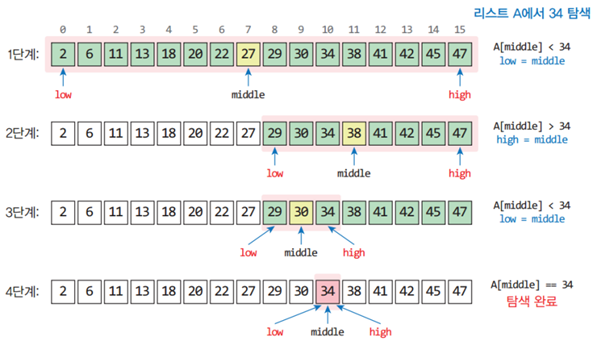 정렬된 배열에만 적합하며 먼저 배열의 중간 값을 조사해 더 큰지/작은지 비교한 후 오른쪽/왼쪽으로 다시 반으로 나눠 중간 값을 조사해 반복하는 탐색 방식으로 순차탐색보다 상당히 빠르다