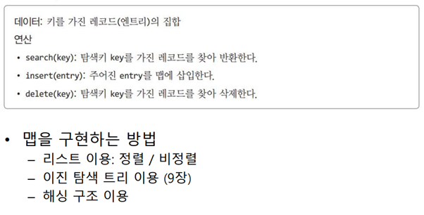 맵(map) 또는 딕셔너리(dictionary)는 엔트리/키를 가진 레코드의 집합이며