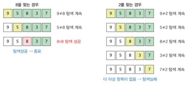 정렬 or 정렬되지 않은 배열의 처음부터 마지막까지 하나씩 검사하는 간단한 탐색 방법이다
