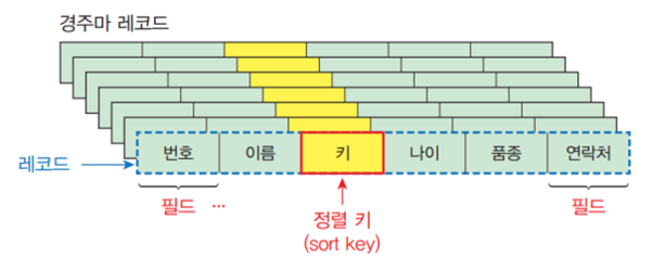 여러 개의 필드로 구성되는 레코드는 정렬의 대상이며 정렬 키를 기준으로 정렬된다