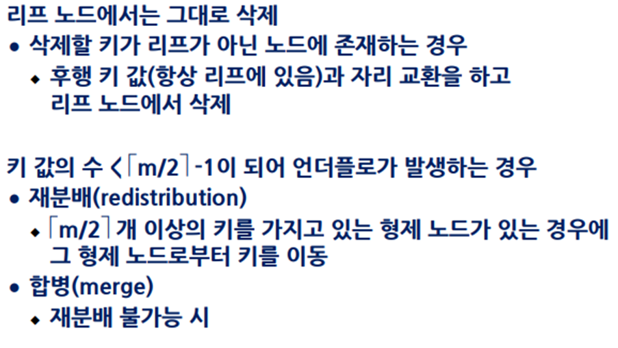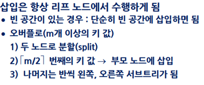- 루트와 리프를 제외한 내부 노트는 최소 m/2, 최대 m개의 서브트리를 가짐