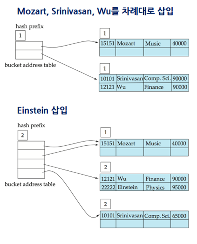 이 때 오버플로 버킷이 생겨난다면 해싱의 장점을 잃기 때문에 확장성 해싱으로 충돌에 대처한다