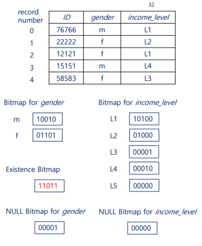 애트리뷰트의 값이 몇가지 되지 않을 때(소득수준, 성별, 국가 등) 비트맵 인덱스를 활용한다