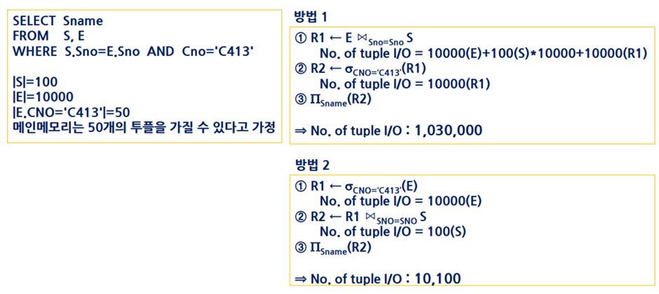 마지막으로 질의문 계획(plan)의 평가 및 결정이 이루어지는데, 최소 비용의 계획이 선택된다