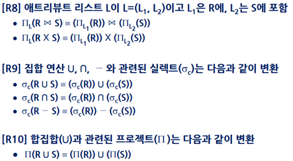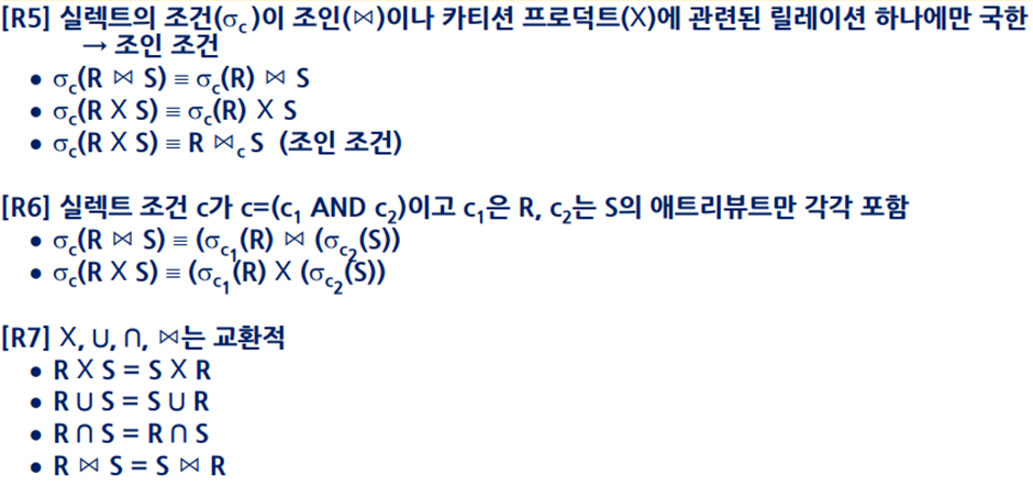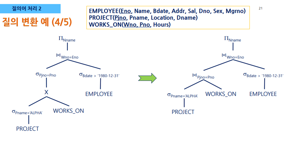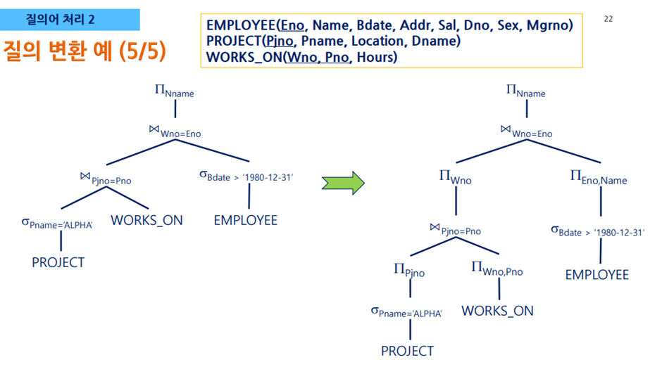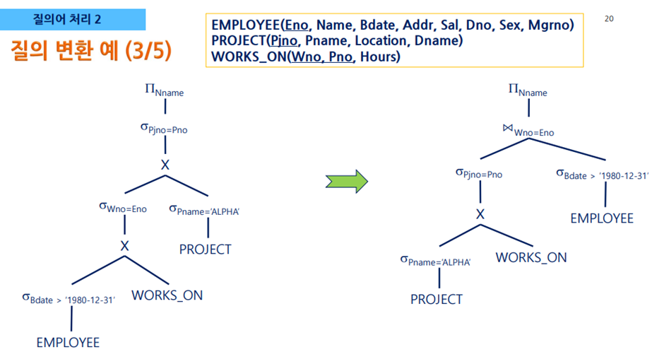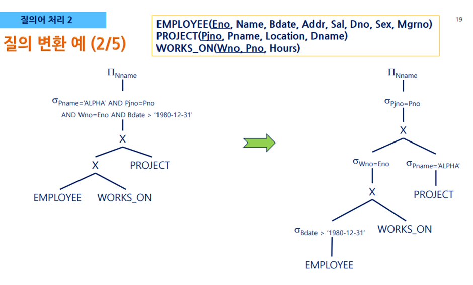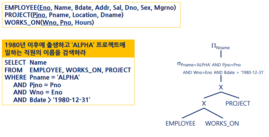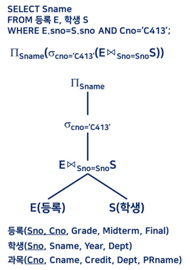 - 질의문 트리의 단말 노드에는 피연산자인 릴레이션이, 내부 노드에는 관계대수 연산자가 들어간다