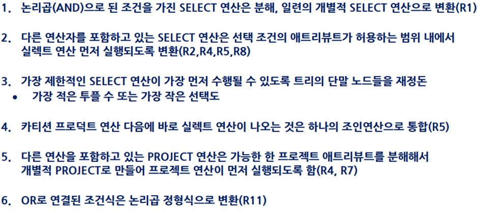 ‘질의문 내부표현 -> 효율적 내부형태로 변환 -> 후보 프로시저 선정 -> 평가 및 결정’