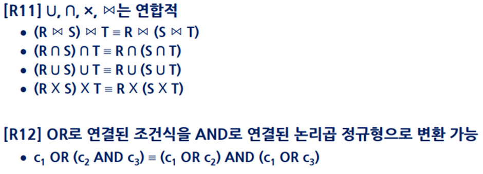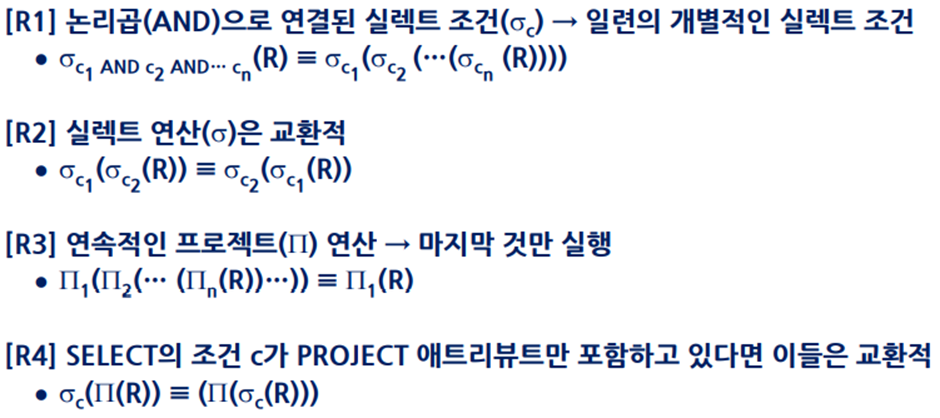 비용(cost)식: ‘디스크 입출력(I/O) 비용 / 중간 결과 저장 비용 / CPU 시간 / 통신 비용’ 영향
