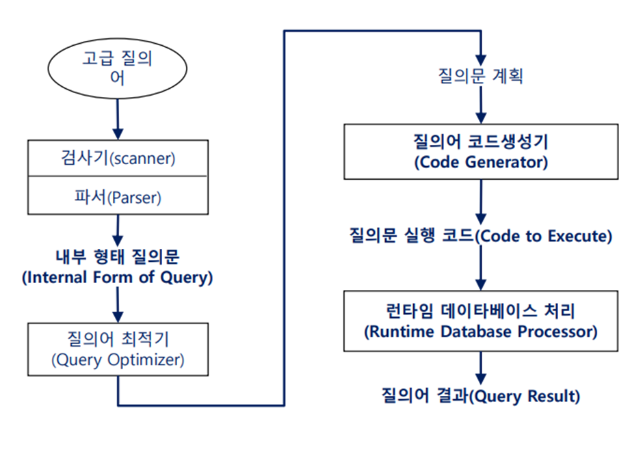 - SQL(고급 질의어)가 scanner를 거치면서 token(의미)이 생성되고 내부 형태 질의문으로 변환된다