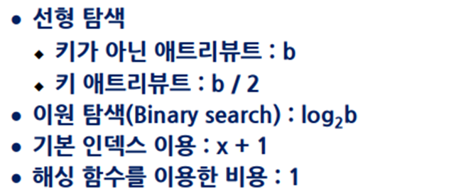 파일의 크기 / 레코드의 수(r), 블록 수(b), 파일에 대한 블록 인수(br) / 정렬, 인덱스 혹은 해시 여부 / 애트리뷰트 값에 대해 서로 상이한 값의 수(d) / 검색 튜플 수