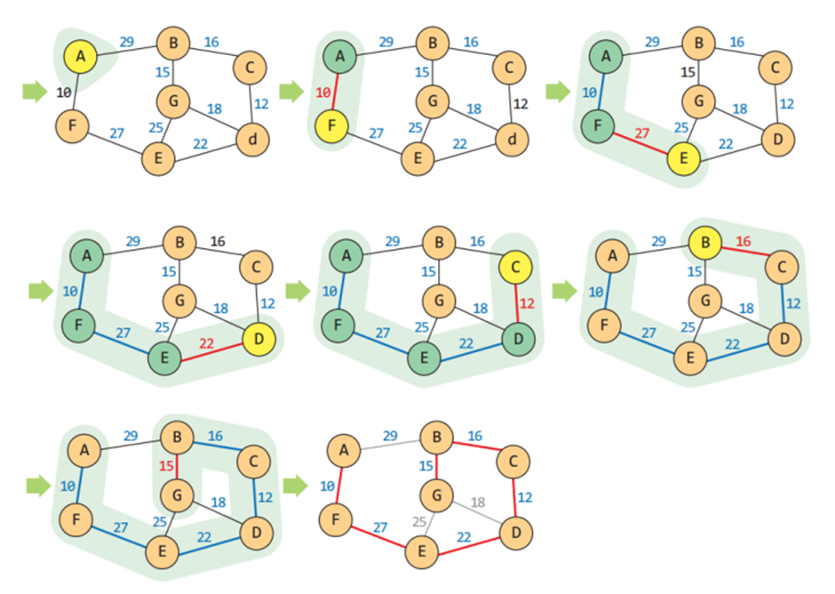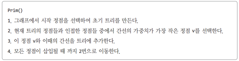 Prim의 MST 알고리즘은 하나의 정점에서부터 트리를 단계적으로 확장한다