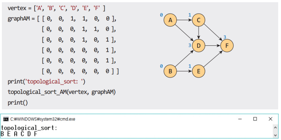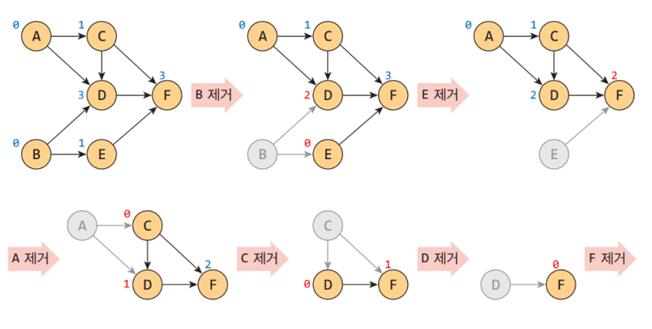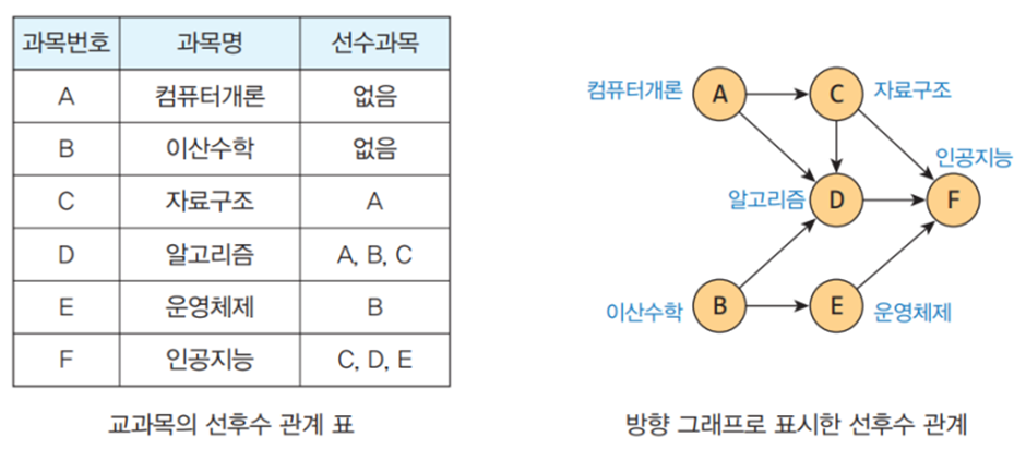 위상 정렬이란 방향 그래프에 대해 정점들의 선행 순서를 위반하지 않으면서 모든 정점을 나열하는 것