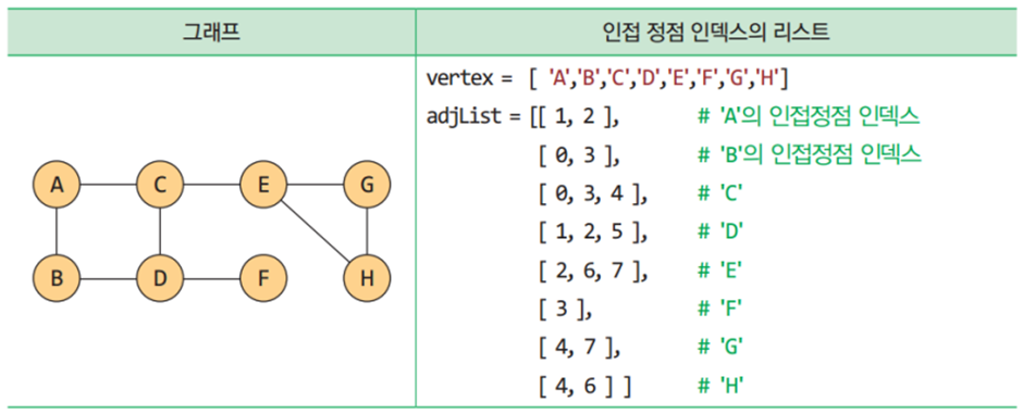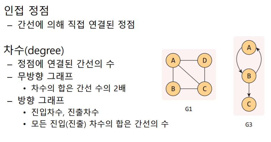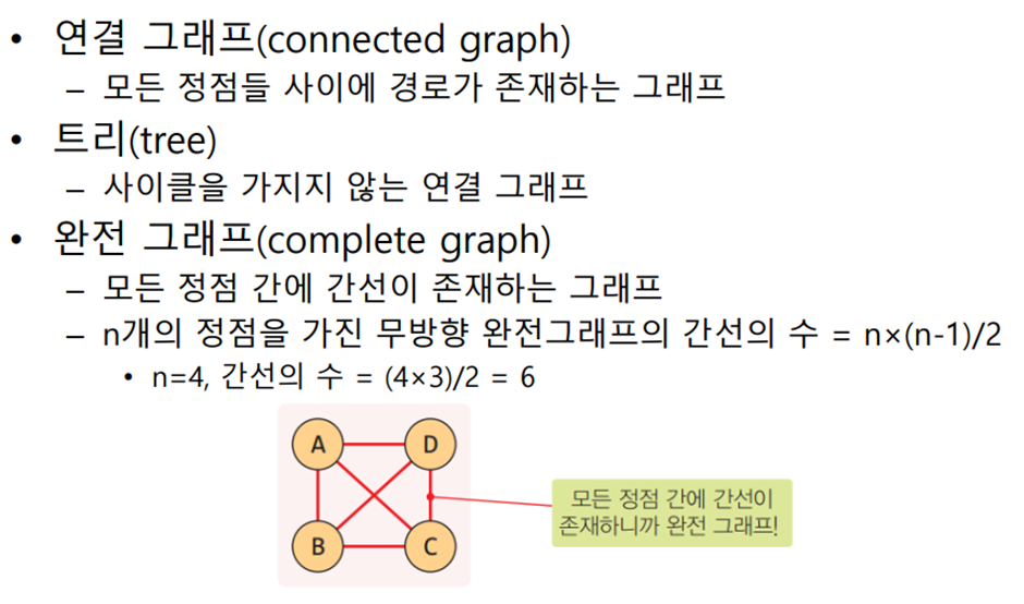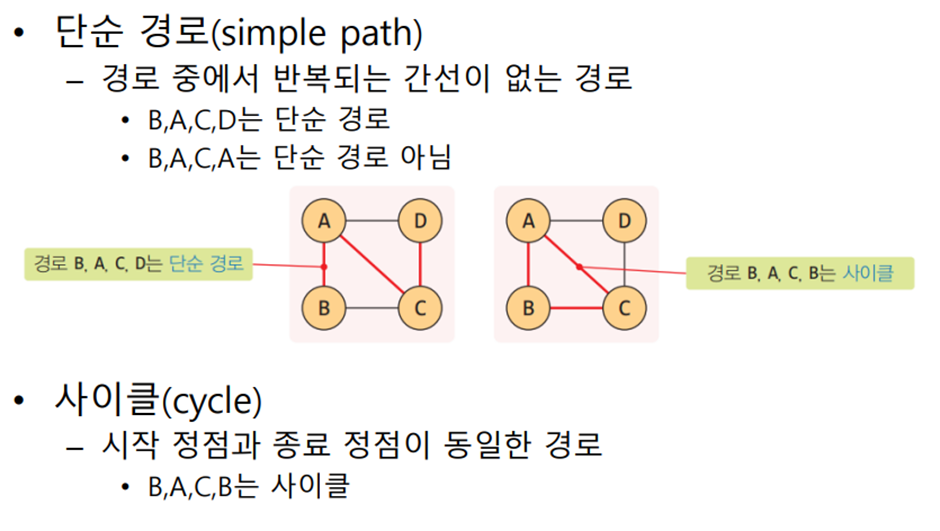 - 그래프의 경로: 정점 간 거쳐가는 경로 ex) B -> A -> C -> D