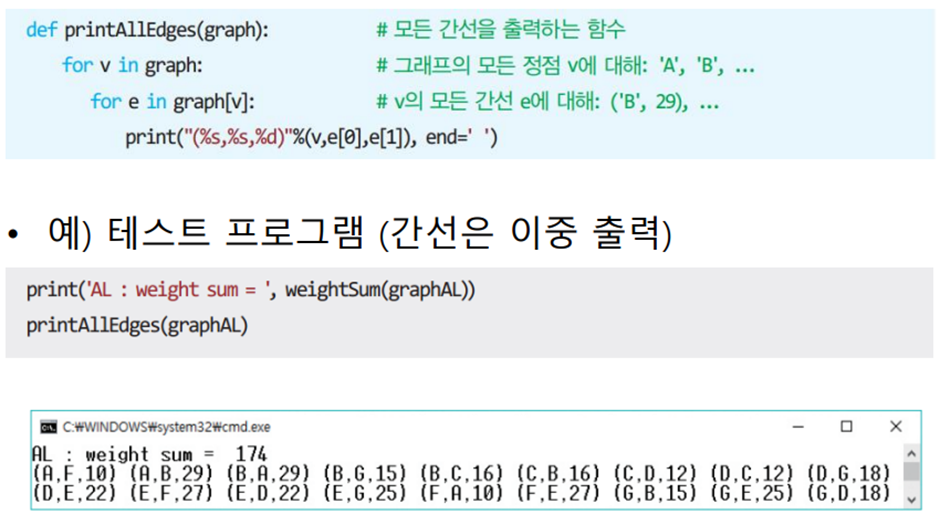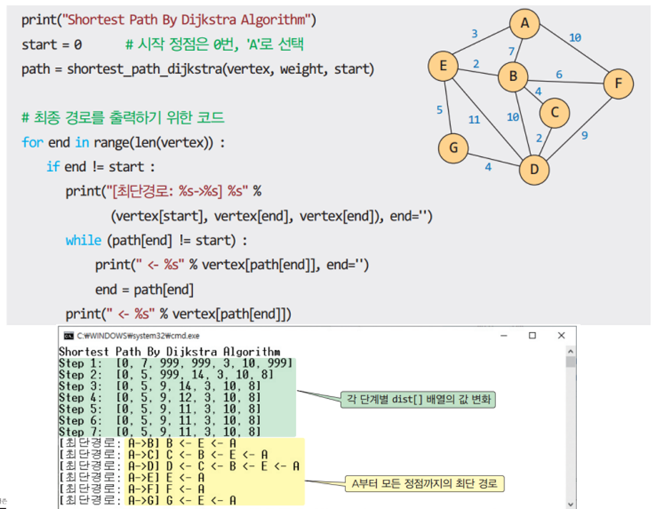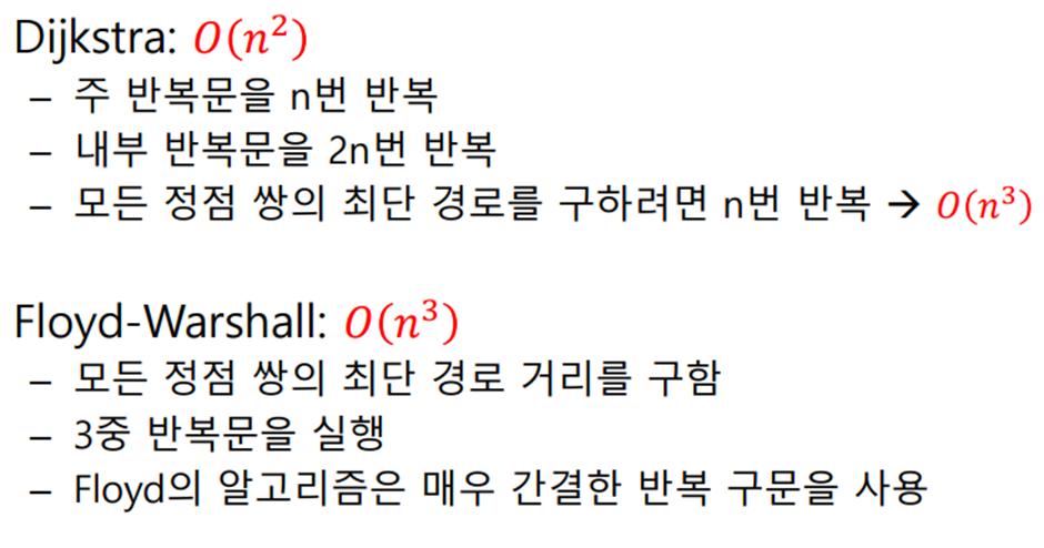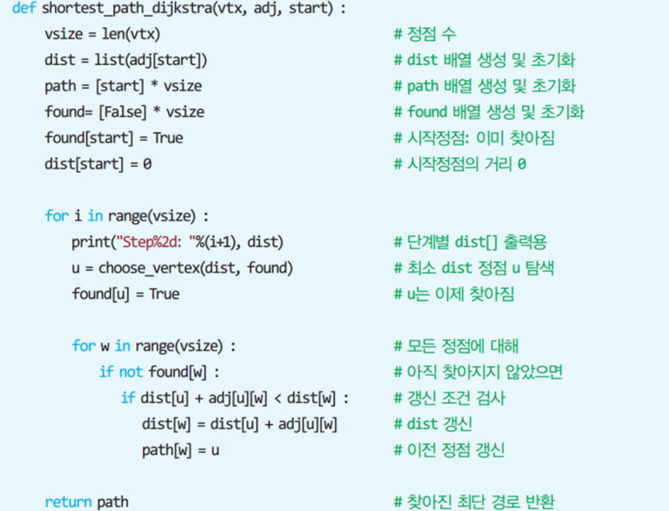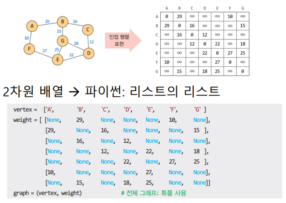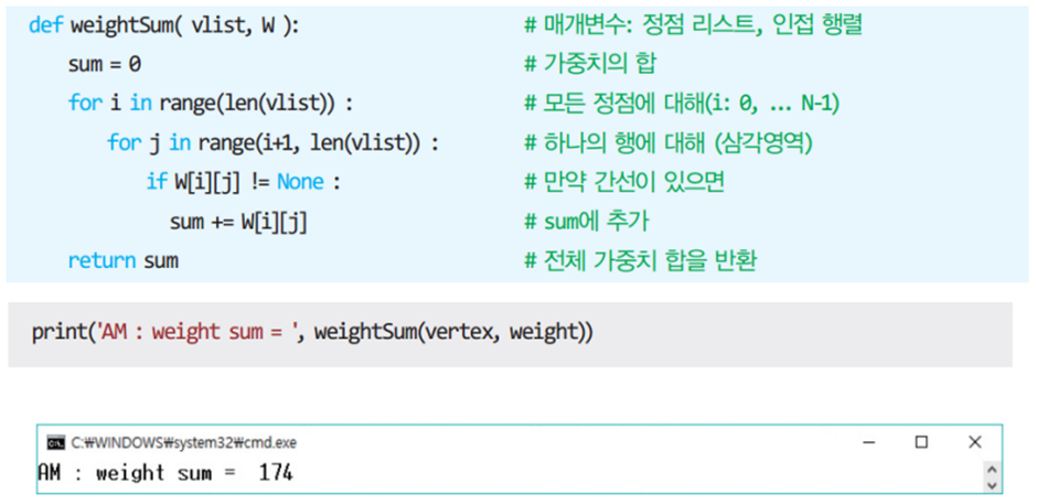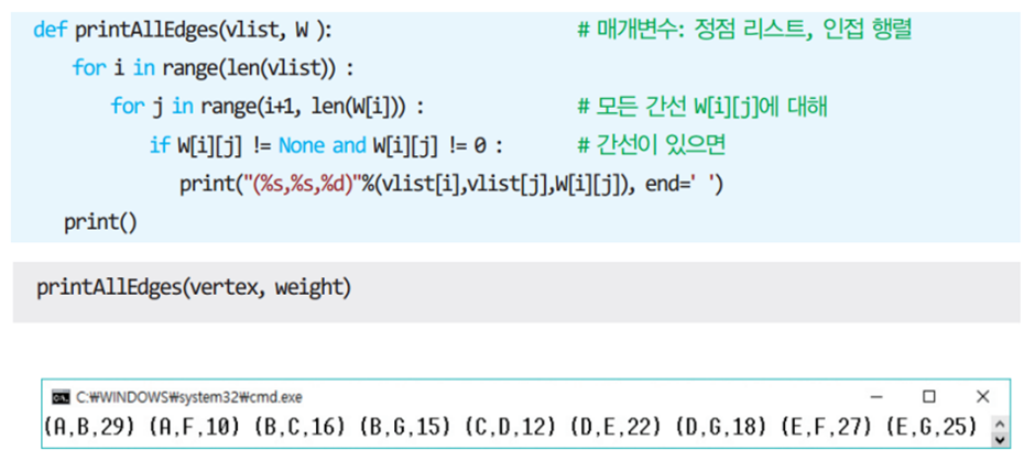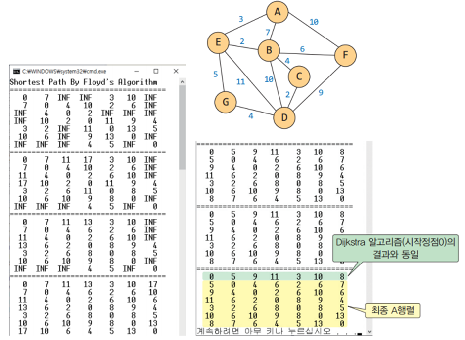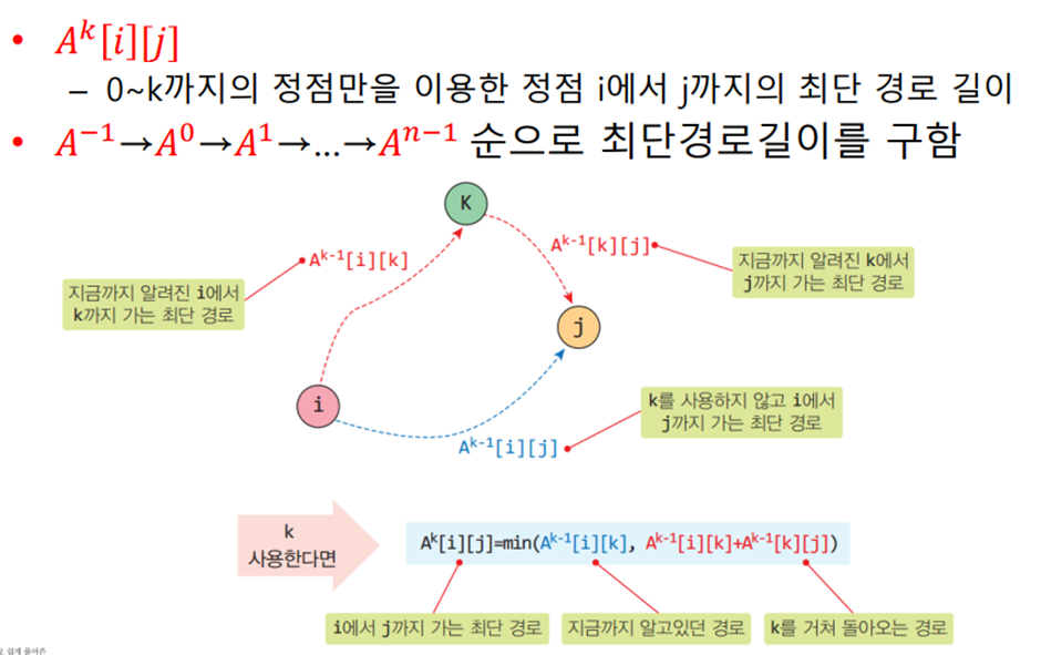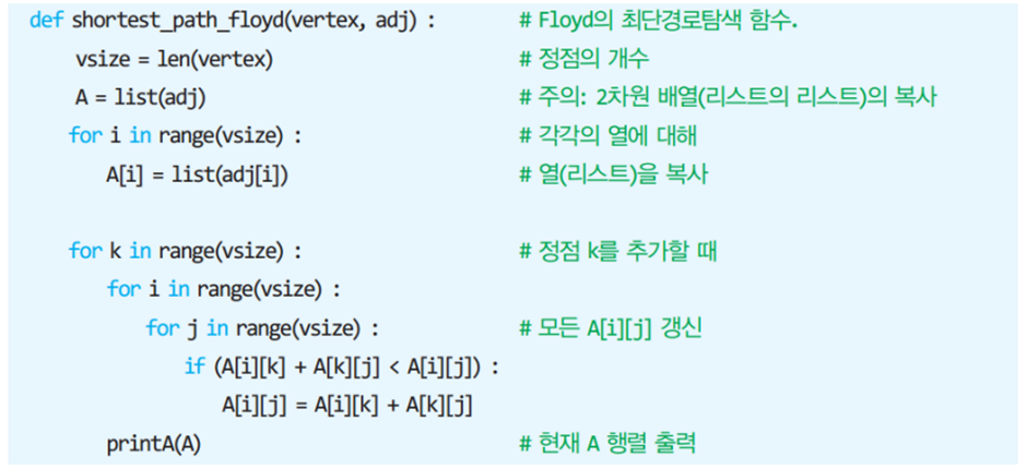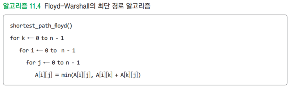 * 2차원 배열 A를 이용하여 3중 반복하는 루프로 구성되며 초기 값은 인접 행렬의 가중치이다