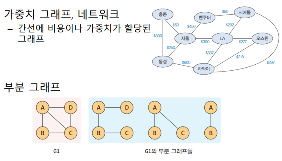 간선에 가중치가 할당된 그래프이며 G = (V, E, w)로 표현한다 (w: 비용/가중치/길이)
