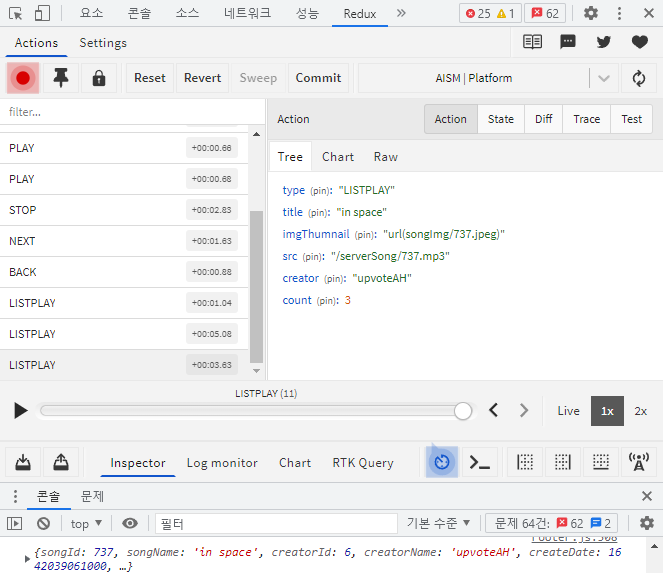 이제 해당 탭에서 Redux의 Action 값, State 값, Diff(차이점) 등을 실시간으로 체크할 수 있다