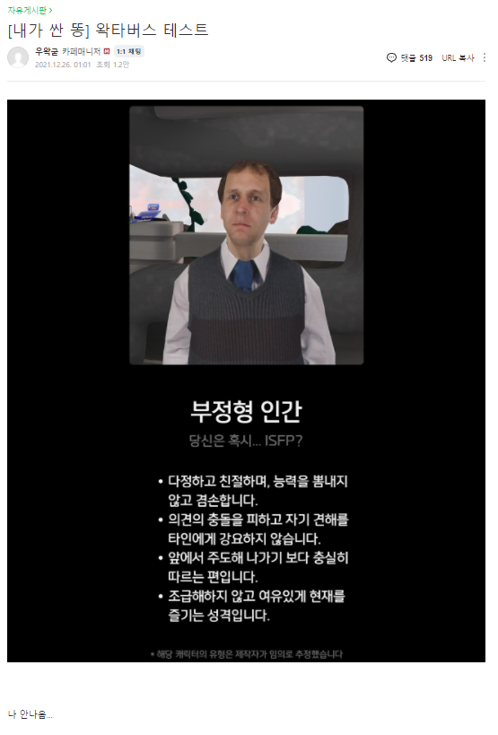 테스트 시작하기 안녕하세요, 팬치 여러분! 카페에 올리는 첫 글이자 2021연공전 출품작으로 '왁타버스 캐릭터 테스트'를 제작했습니다 개발 뉴비가 학기중에 틈틈이 만들었다...