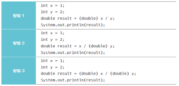 정수 연산결과를 실수로 저장하려면 실수 연산으로의 변환이 필요