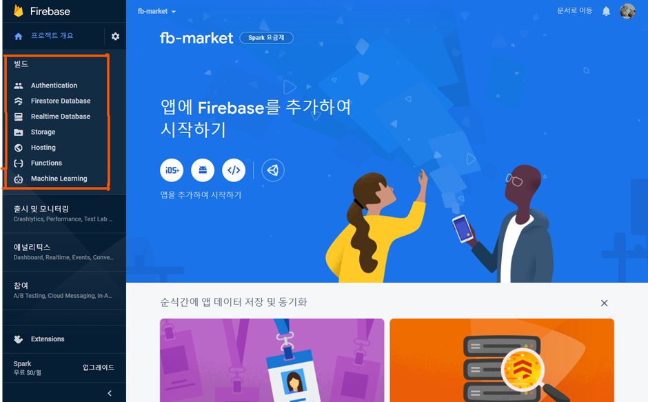 2. 좌측 '빌드' 탭에서 사용할 서비스들을 활성화해준다