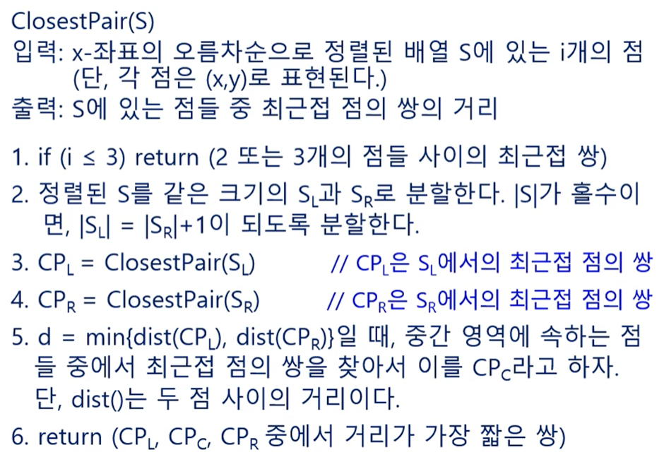 최근접 점의 쌍 문제: 2차원 평면상의 n개의 점이 입력으로 주어질 때, 거리가 가장 가까운 한 쌍의 점을 찾는 문제