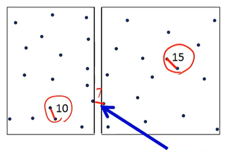 - 중간 영역 최소 거리를 구할 때, y좌표로 정렬 ~ O(nlogn), 주변 점과 비교 ~ O(1)