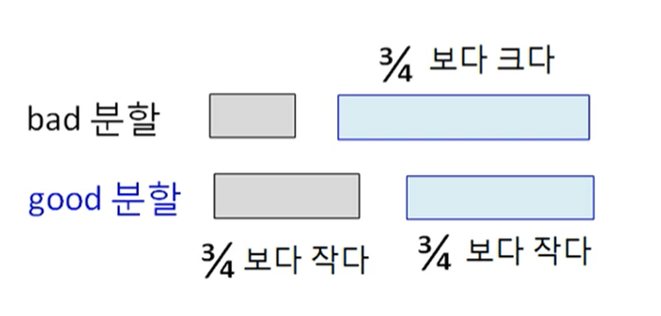 평균 경우 시간 복잡도(= good 분할이 1/2 = 2 * 전부 good 분할인 경우 시간복잡도)
