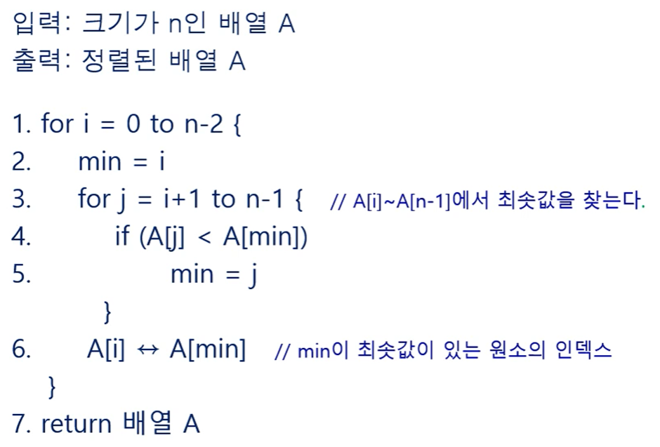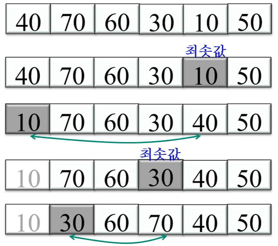 배열 전체에서 최솟값을 선택에 0번 원소와 자리를 바꾸고, 다시 나머지 원소에서 최소값을 선택에 1번 원소와 자리를 바꾸는 과정을 반복해 정렬하는 알고리즘