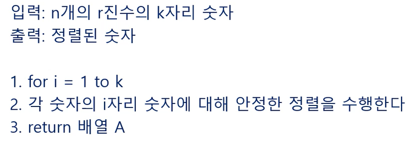 for 루프 k번 반복 / i자리 수를 읽으며 r개로 분류 + 숫자 이동 O(n+r)